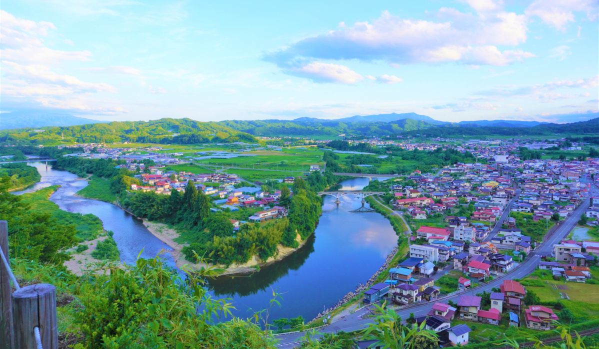 大江町は山形県村山平野の西部に位置し、りんご、スモモなど糖度の高い果物が味わえます。高台にある日本一公園(左沢楯山城史跡公園)からは、朝日連峰や蔵王の山々を眺めることができます。「最上川舟唄発祥の地」